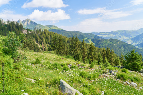 Fantasy Landschaft mit Pfad in grünem Wald mit Bäumen
