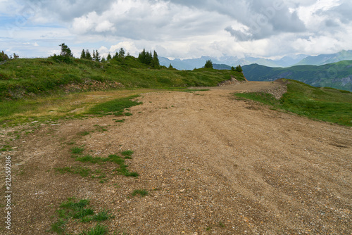 Scenic mountain landscape view with vast green fields and snowy peaks