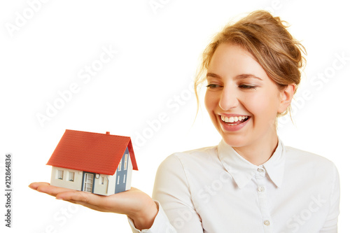 Frau trägt Einfamilienhaus auf ihrer Hand