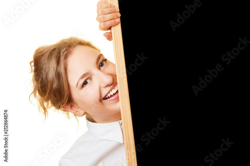 Frau schaut lachend hinter Kreidetafel Hintergrund hervor