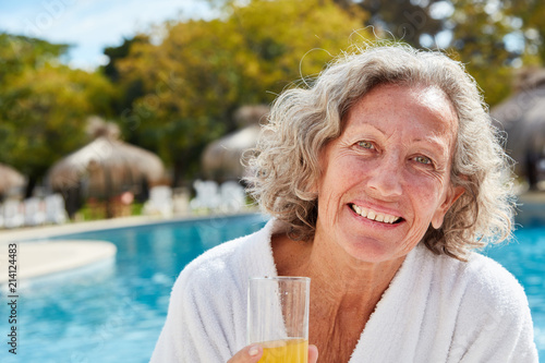 Paar Senioren mit Orangensaft im Wellness Urlaub
