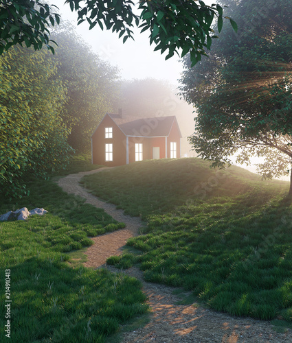 Charming fairy tale cottage nestled in a lush forest with vibrant greenery