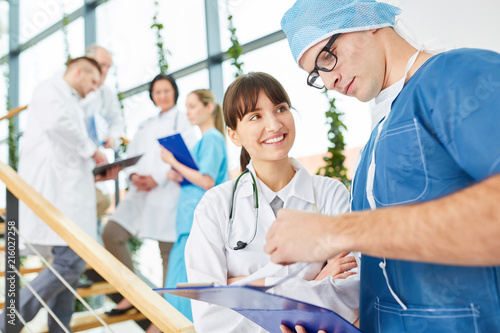 Ältere Frau als Chefarzt vor ihrem Ärzteteam