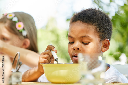 Afrikanischer Junge und ein Mädchen beim Frühstück