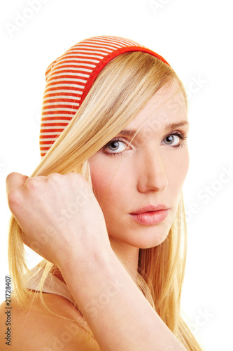Blonde Frau trägt gestreifte Kapuze