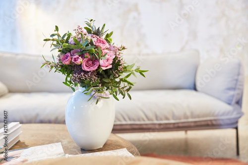 Blumenstrauß mit rosa Rosen im Wohnzimmer