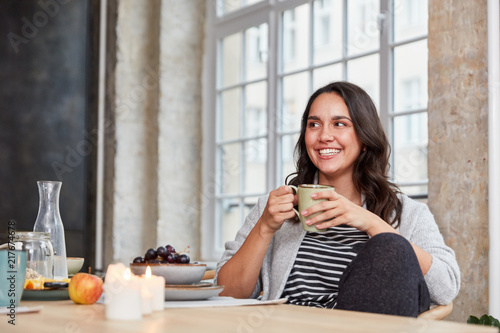 Frau trinkt gemütlich Tasse Kaffee in Küche