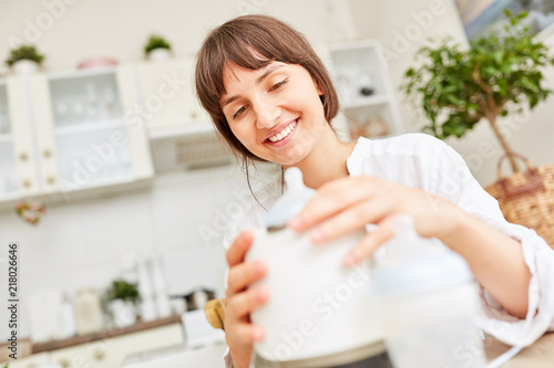 Mutter beim Erwärmen von Babymilch