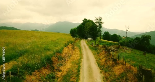 Birds eye tracking shot of country road with houses in Rhône-Alpes