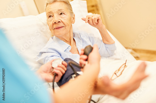 Kontrolle des Blutdrucks bei Senior Frau