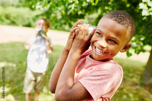 Kinder telefonieren mit dem Dosentelefon