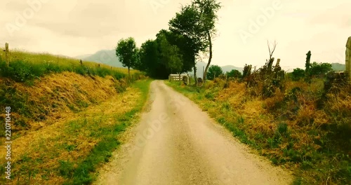 Birds eye tracking shot of country road with houses in Rhône-Alpes