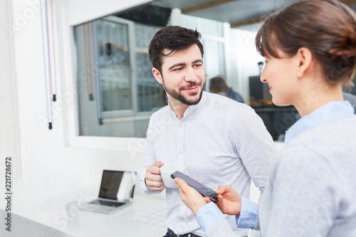 Geschäftsmann und Geschäftsfrau beim Smalltalk