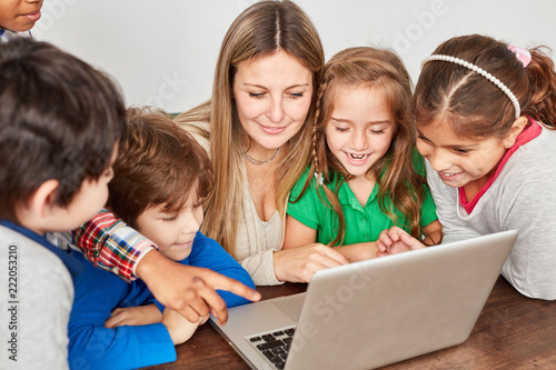 Lehrerin und Gruppe Kinder lernen am Laptop