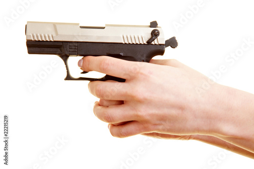 Polizistin zeigt Pistole und Munition
