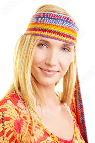 Lachende blonde Frau mit Schal um den Kopf gewickelt