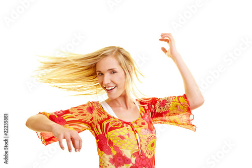 Lachende blonde Frau tanzt