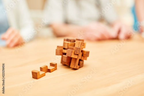 Senioren machen ein Geduldspiel mit Holzpuzzle