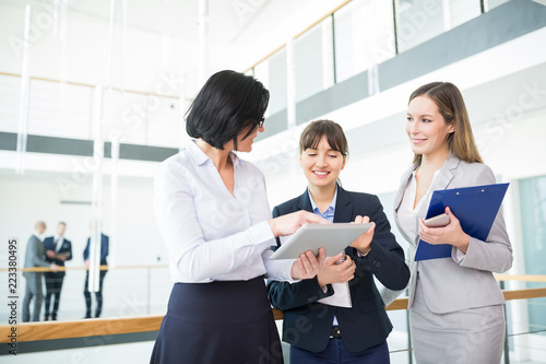 Drei Geschäftsfrauen schauen auf einen Tablet