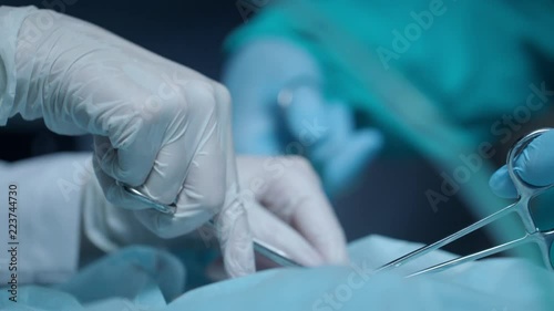 Surgery hands performing operation. Close up of medical hand holding surgical tools. Surgery hands at medical operation. Medical procedure #223744730