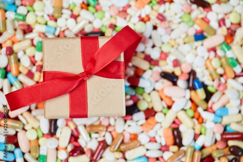 Bunte Medikamente als Rahmen vor blauem Hintergrund