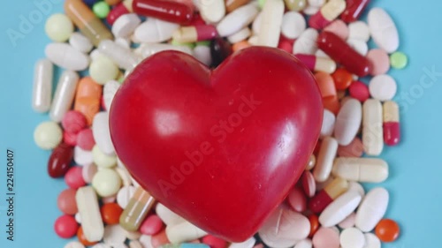 Tilt shot of heart among many medication pills