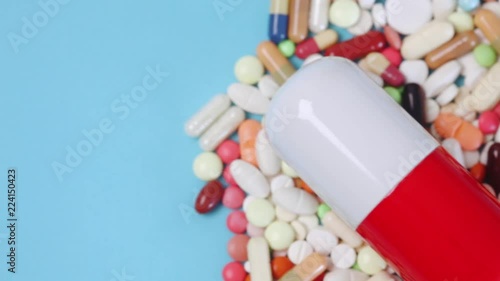 Closeup of pile of pills in blisters rotating counterclockwise in a loop