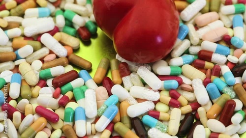 Big pills on pile of colourful medication pills rotating in a seamless loop