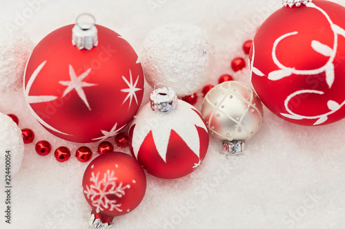Karte zu Weihnachten mit Schnee und Christbaumkugeln