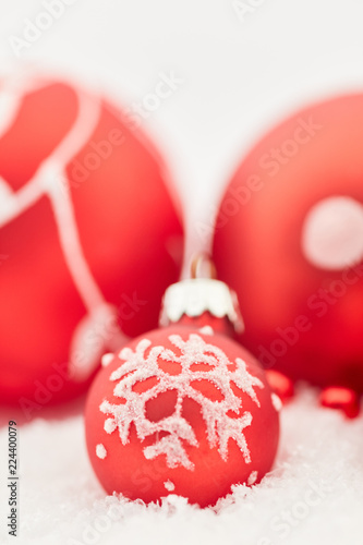Karte zu Weihnachten mit Schnee und Christbaumkugeln