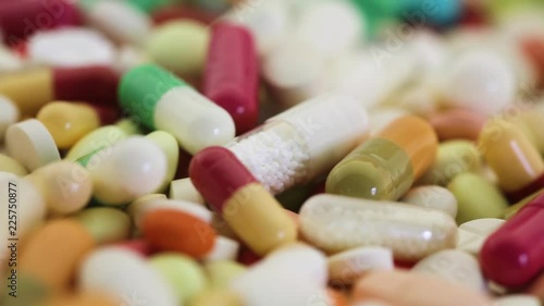 Closeup of pile of pills in blisters rotating counterclockwise in a loop