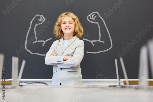Mädchen in Schule steht vor Tafel mit Muskeln
