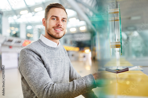 Mann steht lächelnd am Check-In Schalter