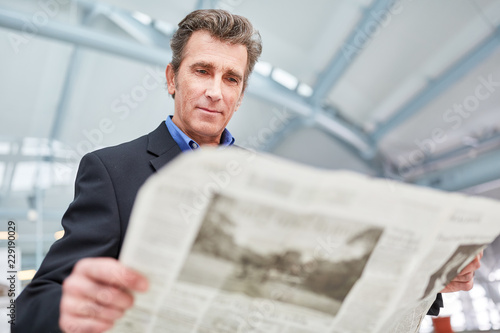 Geschäftsmann liest eine Tageszeitung im Flughafen