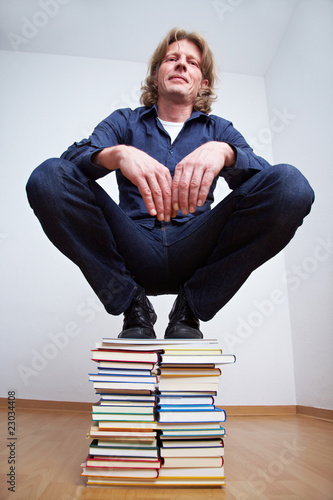 Mann hockt auf Bücherstapel