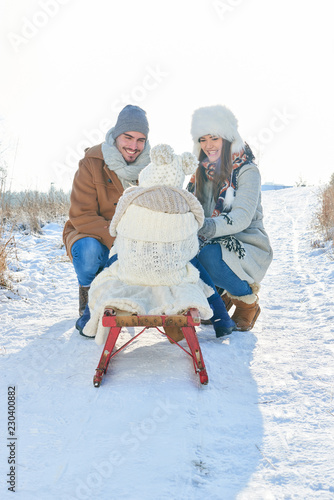 Eltern ziehen Kind auf dem Schlitten im Schnee