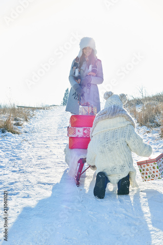Familie hat Spaß beim Schlitten fahren und rodeln