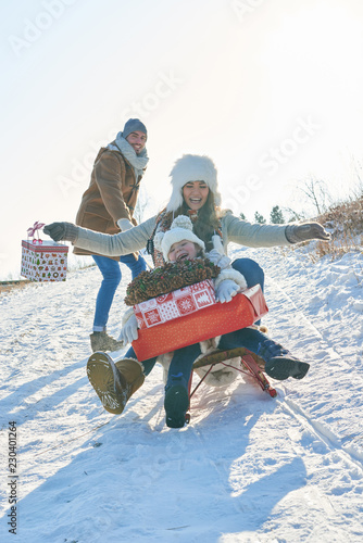 Familie mit Geschenken auf einem Schlitten