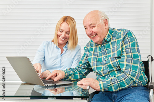 Neugierige Seniorin im Rollstuhl mit Tablet PC