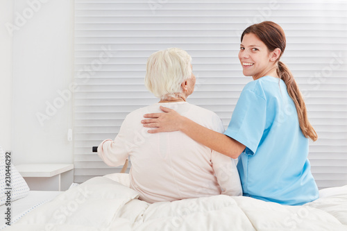 Pflegerin hilft Seniorin aus dem Bett in der Reha