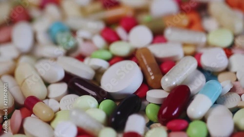 Closeup of pile of pills in blisters rotating counterclockwise in a loop