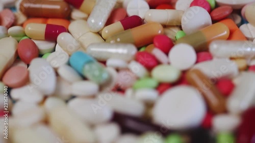 Closeup of pile of pills in blisters rotating counterclockwise in a loop