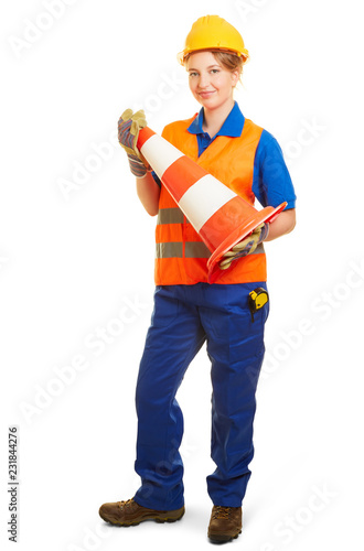 Woman in road construction in workwear with pyon