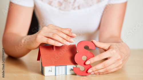 Frau trägt Einfamilienhaus auf ihrer Hand