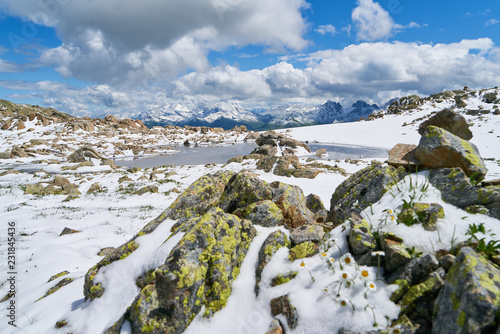 Panoramic snowy mountain landscape featuring rugged rocks and clear blue skies