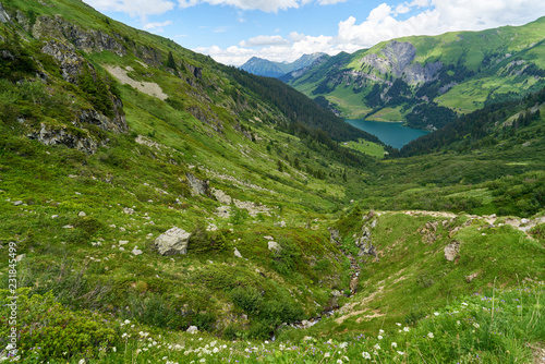 Wide panorama of alpine landscape with snowy mountains and clear sky