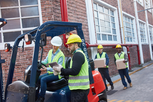 Lagerarbeiter mit Paketen und Gabelstapler
