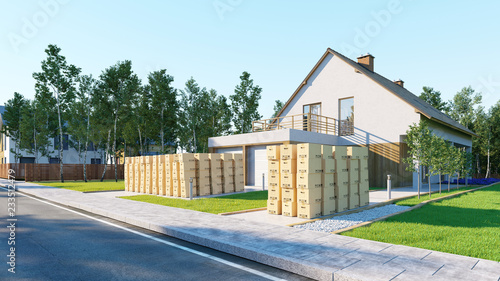 Umzugskartons beim Umzug vor Einfamilienhaus