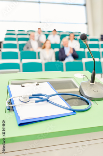 Stethoskop und Klemmbrett im Uni Hörsaal