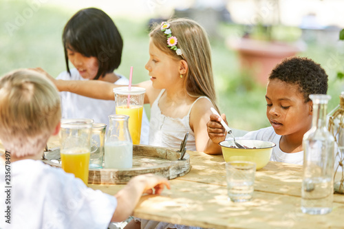 Gruppe Kinder essen gemeinsam Müsli zum Frühstück